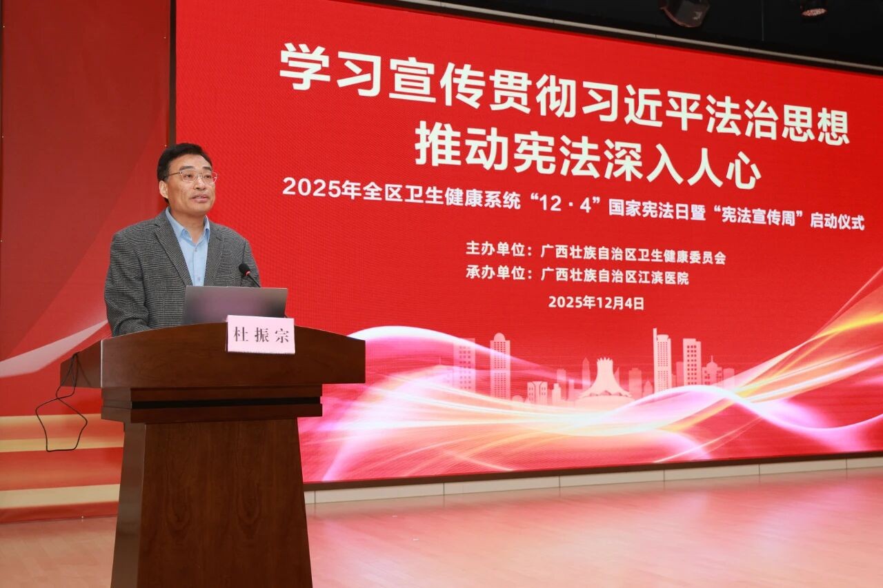 启动仪式上,自治区卫生健康委党组书记、主任杜振宗作了讲话。他在讲话中阐述了宪法在治国理政中的重要地位和作用,回顾了“十四五”以来全区卫生健康系统法治建设取得的成绩,并对继续运用法治思维和法治方式保障健康广西建设提出明确要求。他强调,全区卫生健康系统要持续深化习近平法治思想学习宣传贯彻,坚定不移推进宪法实施,压紧压实法治建设第一责任人职责,全力抓好法治建设重点任务落实,持续深化卫生健康普法依法治理工作。