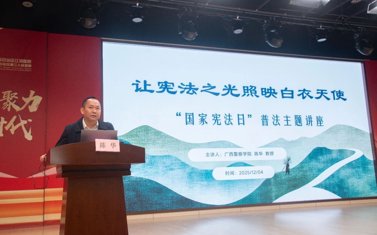 广西警察学院陈华教授应邀作了题为《让宪法之光照映白衣天使》的国家宪法日主题讲座。讲座紧密围绕生命权、隐私权、平等权等,结合执业中的典型场景与案例,为临床决策提供了清晰的法律依据与风险防范指引,有效提升了医务人员的宪法意识与法治实践能力。