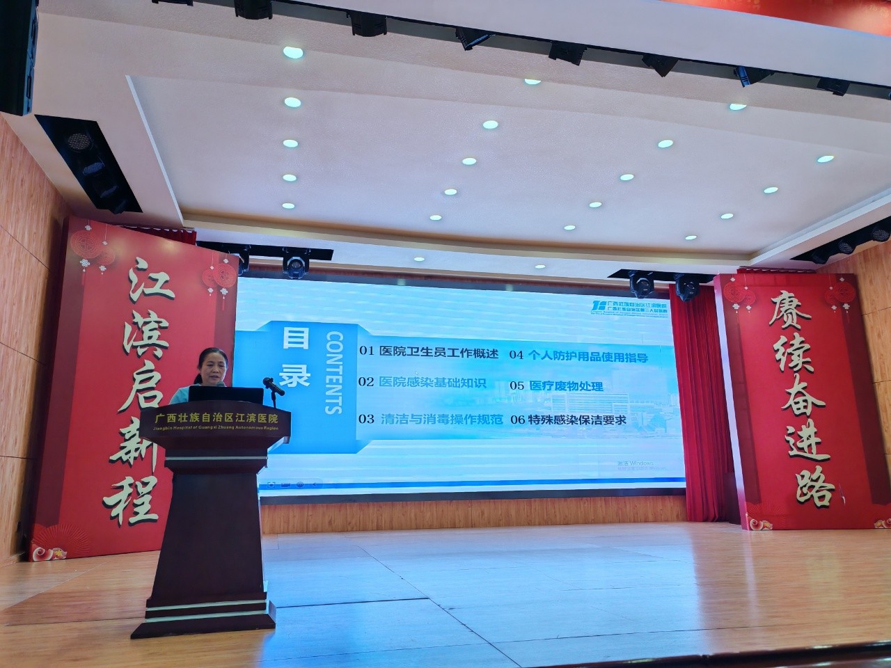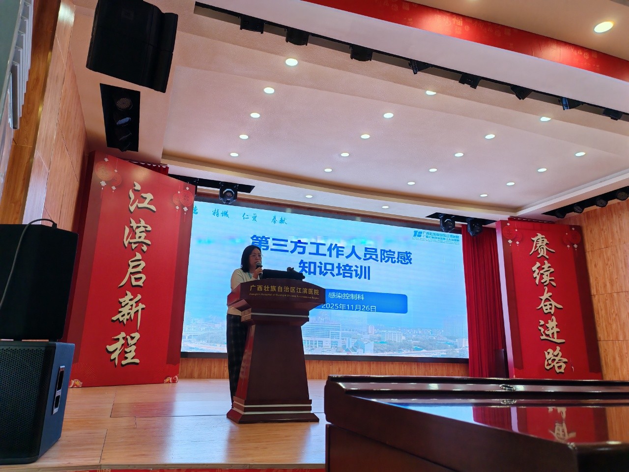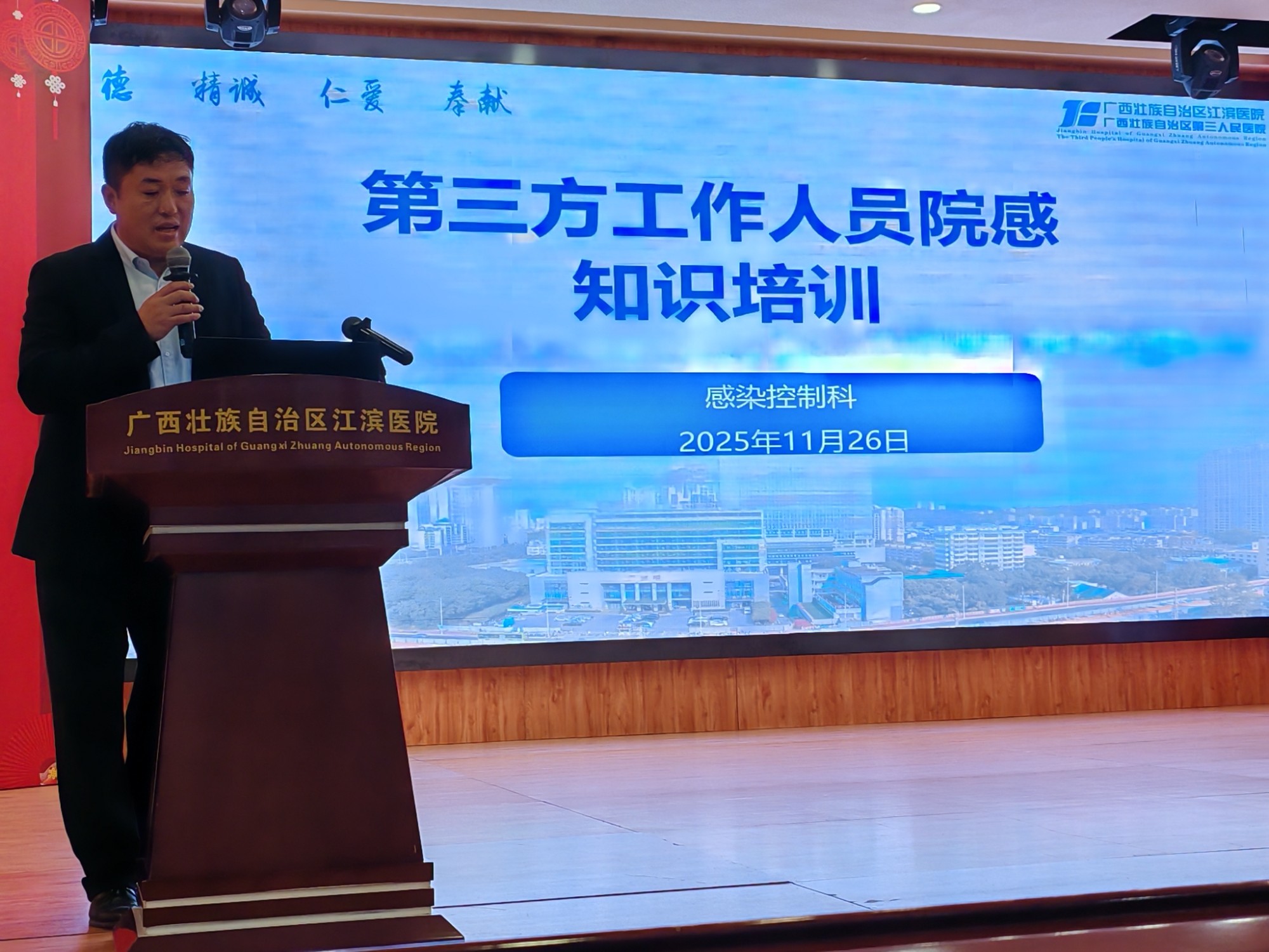 为进一步深化医院感染管理工作,提升第三方工作人员的专业素养与风险防控能力,筑牢医院感染防控的“第一道防线”,11月26日,广西江滨医院(自治区第三人民医院)感染控制科联合后勤部举办了第三方工作人员感控专项培训。培训覆盖了医院保洁人员、司梯员、医疗废物转运人员等工作人员,后勤管理部黄斌组长、后勤管理有限公司杨宏宇总经理出席此次培训。
