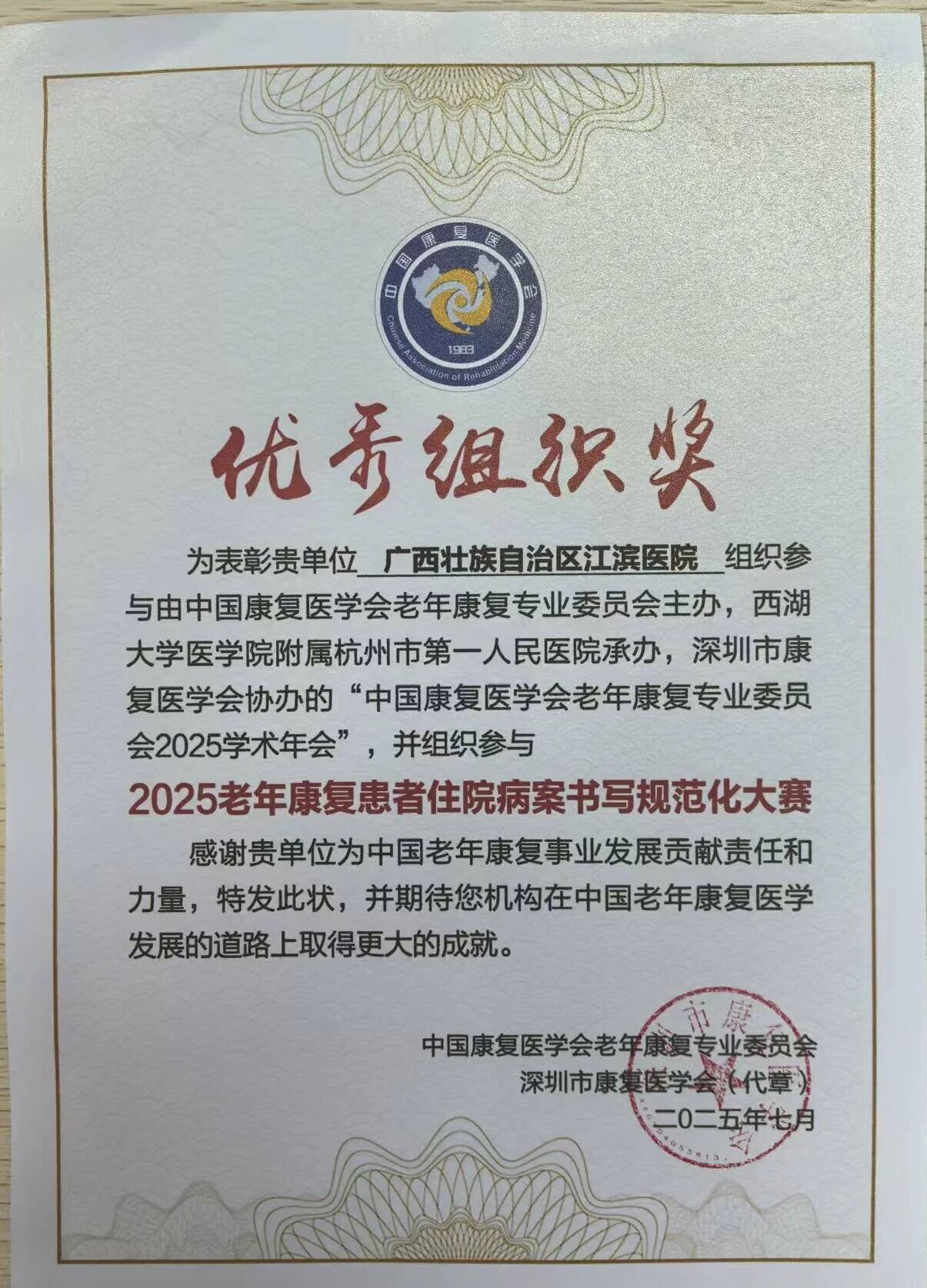 为进一步提升老年康复病历书写的规范性与专业性,推动康复医疗服务质量提升,近日,由中国康复医学会老年康复专业委员会主办的“2025年老年康复患者住院病案书写规范化大赛”在杭州落幕。广西江滨医院(自治区第三人民医院)脊髓康复科团队凭借扎实的临床功底和严谨的病历书写,荣获“三等奖”及“最佳组织奖”!