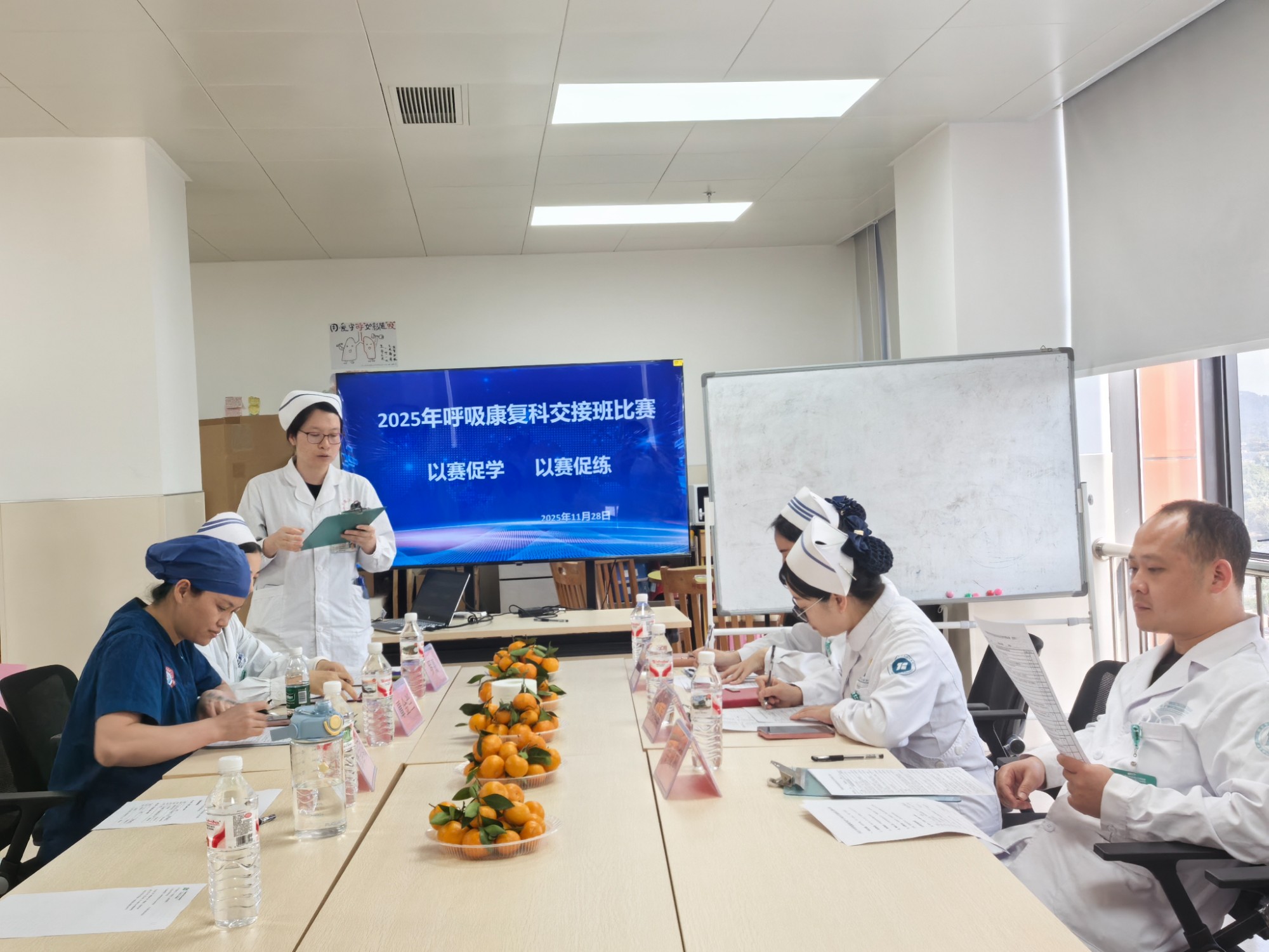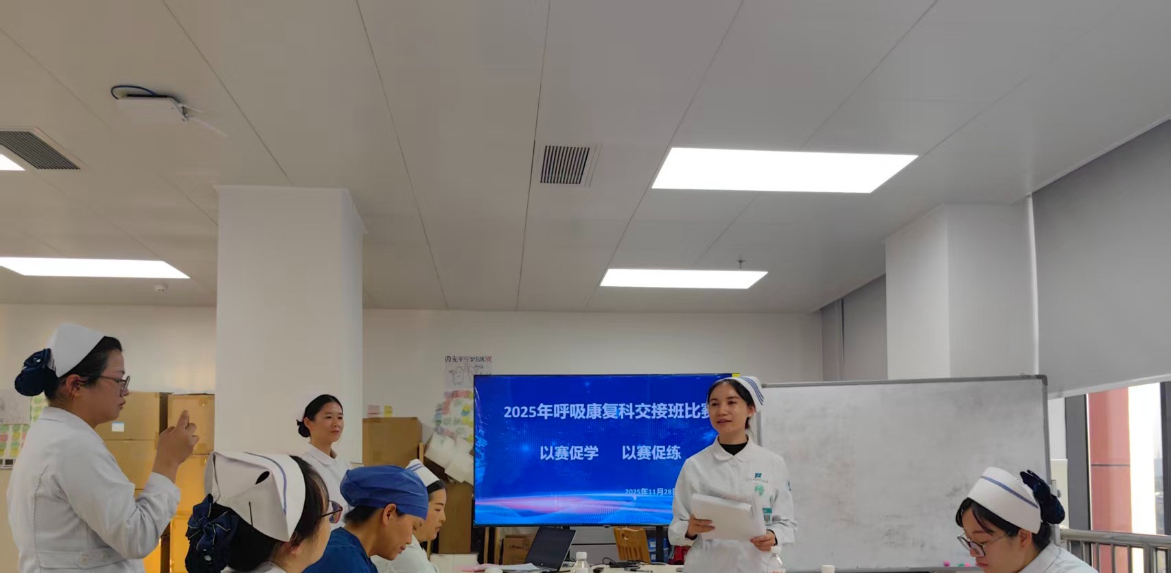 为积极响应护理部推行的“SBAR交班模式”,进一步夯实护理安全根基,提升护理服务的专业化与同质化水平,广西江滨医院(自治区第三人民医院)呼吸与危重症医学二科/呼吸康复科于11月28日精心组织开展了以“追求卓越,‘交’以用心,‘接’以规范”为主题的护理床旁交接班比赛。比赛旨在通过标准化、程序化、精准化的交班流程,打造无缝隙、高品质的护理服务链条,为患者安全保驾护航。