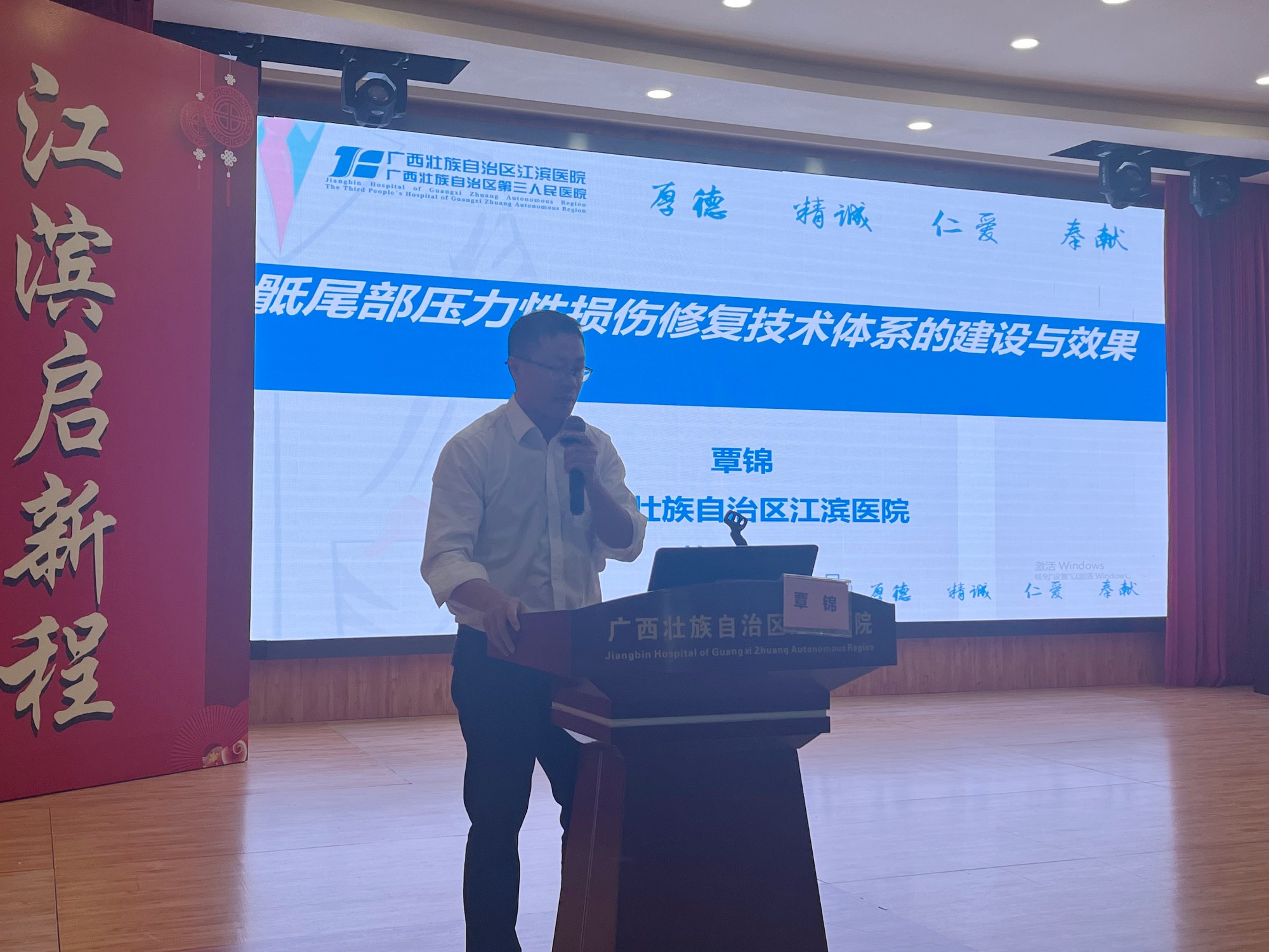 本次培训聚焦压力性损伤修复技术体系的建设以及效果、整形美容、伤口居家护理等核心领域。我院泌尿外科·整形外科副主任医师覃锦以《中胚层疗法在皮肤美容中的应用》开篇,分享了在皮肤美容领域三大核心技术的应用与进展,涵盖中胚层疗法、化学剥脱术及透明质酸钠填充剂,为面部年轻化及问题性皮肤治疗提供了新思路。
